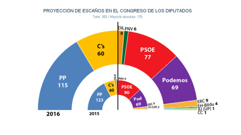 En cambio, los dos partidos emergentes confirmarían su auge: Podemos aumentaría dos décimas su porcentaje sobre los votos válidos –superando en votos, aunque no en escaños, a un PSOE en declive– y Ciudadanos sería la única formación que creciese en número de sufragios, disparándose hasta los 60 escaños y permitiendo así que la derecha sumase mayoría absoluta –con el apoyo de un solo diputado de Coalición Canaria– en el Congreso de los Diputados, pese a la continuada caída del PP, tal como se puede ver en el hemiciclo dibujado más arriba.