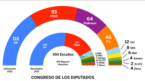 Tras las elecciones generales, no se podrá formar una mayoría absoluta de escaños ni en la izquierda ni en la derecha, ya que PP-Ciudadanos y PSOE-Podemos sumarán los mismos: 157 diputados, a 19 de esa meta. Tampoco habrá ningún grupo nacionalista que tenga esos parlamentarios para un tripartito.