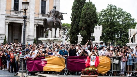 Varias personas dan su último adiós a Raffaella Carrà durante su funeral en la basilica de Santa María en Roma.