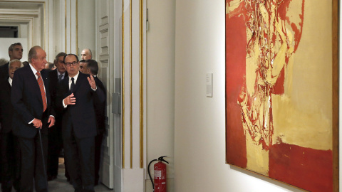 El monarca emérito apadrina una muestra de 41 cuadros y esculturas de artistas contemporáneos de la colección de arte de Patrimonio Nacional