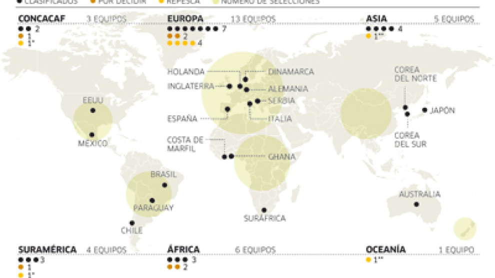 ÁfricaClasificados Ghana y Costa de Marfil, además de Suráfrica como organizador, queda por conocer a los campeones de tres grupos. En el 1, Camerún entra si gana en Marruecos o si Gabón no gana en Togo. En el 2, Túnez debe ganar en Mozambique o esperar a que Nigeria pinche contra Kenia. Y en el 3, el Egipto-Argelia lo decide todo. El empate valdría a los argelinos.