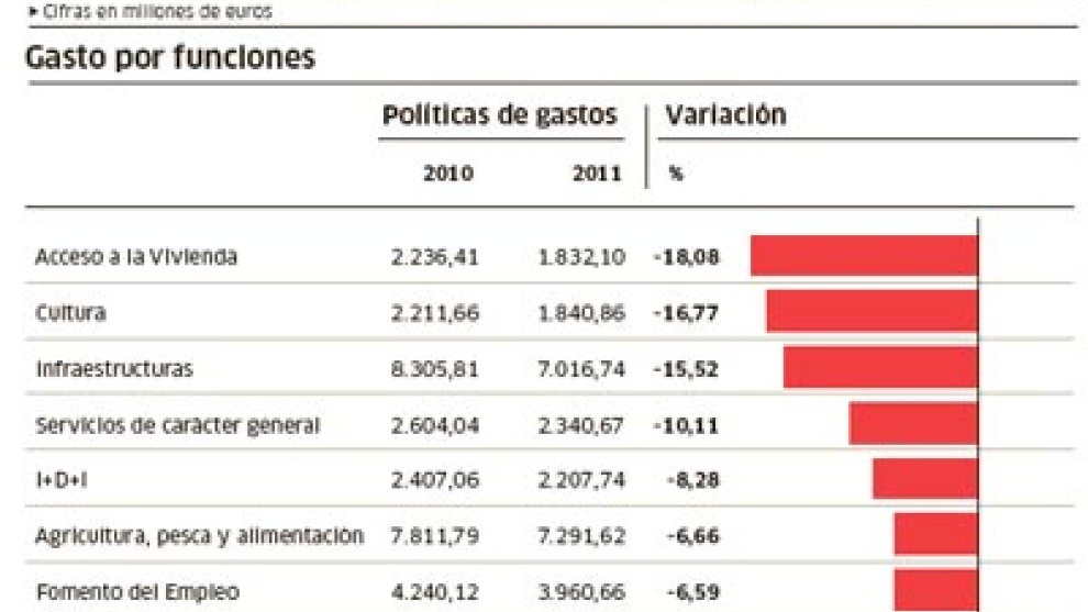 Otra política que sufre un importante recorte es la de infraestructuras. La inversión pública autonómica desciende en 2011 en 1.289 millones, un 15,52% respecto a los presupuestos iniciales para 2010. Pero los mayores ajustes en términos relativos se los llevan las políticas de vivienda y la cultura, que el próximo año dispondrán de un 18,08% y un 16,77% menos de presupuesto (en total, 774 millones menos, entre ambas partidas).