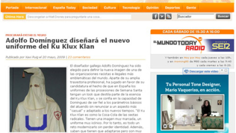 Artículos en clave de humorEn el artículo, fechado el 20 de mayo de 2009 y firmado por Xavi Puig, se narra cómo la organización racista había elegido a Adolfo Domínguez para confeccionar sus nuevos trajes, debido a "su amplia trayectoria profesional" y debido al "hecho de que en España los uniformes de las procesiones de Semana Santa tengan un look que destila parte de la esencia del Ku Klux Klan".