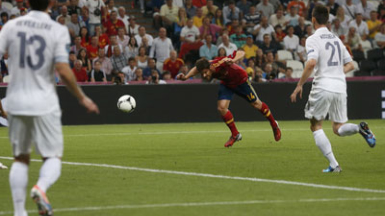 España 2 - Francia 0España: Casillas; Arbeloa, Piqué, Sergio Ramos, Jordi Alba; Busquets, Xabi Alonso, Xavi; Iniesta (Cazorla, m.84), Silva (Pedro, m.64) y Cesc (Fernando Torres, m.67).
