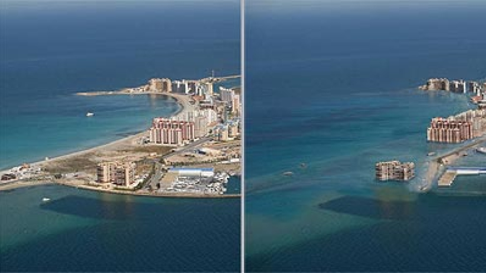 La organización ecologista Greenpeace se sienta hoy en el banquillo, acusada por la inmobiliaria murciana Inversiones Dos Mares de hundir los precios de los pisos en la Manga del Mar Menor. El origen de la denuncia es un fotomontaje presentado por la ONG hace dos años, que mostraba esta lengua de tierra parcialmente sumergida bajo el océano en un futuro hipotético, "tras pocas décadas sin actuar contra el cambio climático".