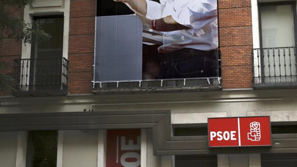 Toda su imagen preside la fachada de Ferraz, lo que para algunos puede parecer un exceso de adanismo –ha habido alguna crítica interna-, pero para la dirección del PSOE es la apuesta clara de que tienen un candidato que potenciar y que es el principal adversario a Mariano Rajoy.