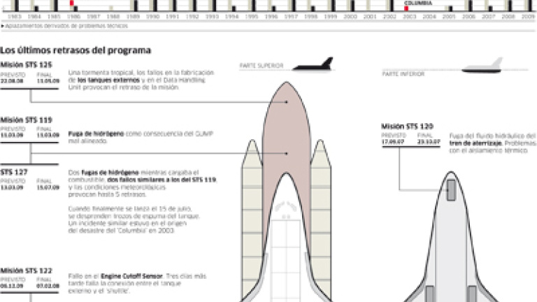 Si no se encuentra el fallo pronto, la salida se retrasará mes y medioSegún un estudio de las bases de datos de la NASA realizado en 2007 por Associated Press, de los 118 lanzamientos de los transbordadores hasta ese momento, 47 habían salido el día previsto. De los retrasos hasta entonces, más de la mitad se habían debido a fallos técnicos.