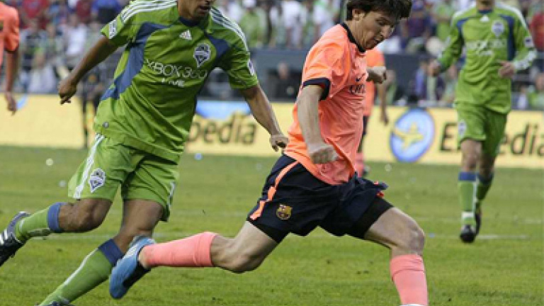 El argentino Lionel Messi acaparó todo el protagonismo y desbordó en 45 minutos de juego a los Seattle Sounders, ante los que anotó sus primeros goles de la pretemporada en la fácil victoria del FC Barcelona (0-4), que presentó una alineación repleta de titulares.