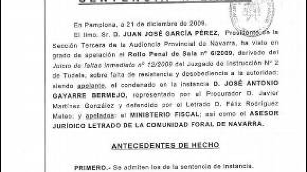 El párrafo anterior podría parecer el inicio de una novela negra pero es uno de los hechos probados que recoge una sentencia de la Audiencia Provincial de Navarra en la que desestima el recurso presentado por José Antonio Gayarre Bermejo y confirma contra él la condena de 400 euros de multa por una falta de desobediencia y resistencia a la autoridad que le impuso con anterioridad el juzgado número dos de Tudela.