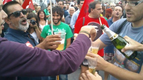 Manifestación por la educación y el transporteMuchos de los que han permanecido en Sol para celebrar con champán la dimisión de Aguirre habían llegado al lugar con la manifestación concluida media hora antes. Miles de personas, entre ellos una gran cantidad de estudiantes, han marchado esta tarde desde el Paseo del Prado hasta la Puerta del Sol en defensa de la escuela pública y por la huelga de transportes.