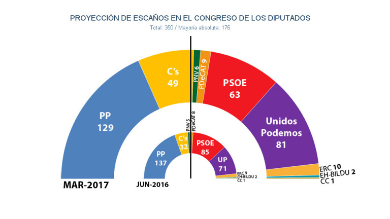 La formación de Albert Rivera quedaría a sólo dos puntos del partido socialista, aunque el sistema electoral aún la dejaría a 32 escaños de distancia, si se celebrasen ahora nuevas elecciones generales, según las estimaciones para 'Público' del gabinete demoscópico Jaime Miquel y Asociados (JM&A). Unidos Podemos obtendría 1,2 millones de votos más que el PSOE y el PP continuaría su caída, perdiendo otro millón de votantes aunque sacaría sólo ocho diputados menos que ahora.