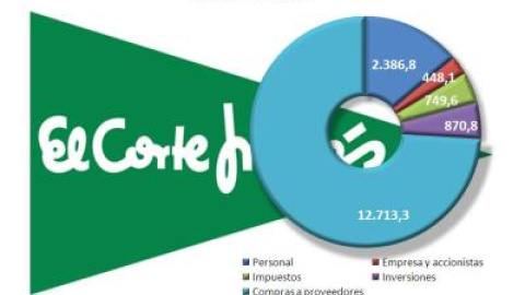El Corte Inglés calcula que el impacto de su actividad en el conjunto de la economía española durante 2011 fue de unos 17.170 millones de euros (ver gráfico adjunto). En esta cifra se incluyen las remuneraciones de sus empleados, los beneficios de la compañía que se han reinvertido en la empresa o se han repartido como dividendo a los accionistas, los impuestos y tasas pagados a las diferentes Administraciones Públicas, las inversiones del grupo y las compras realizadas a los proveedores.