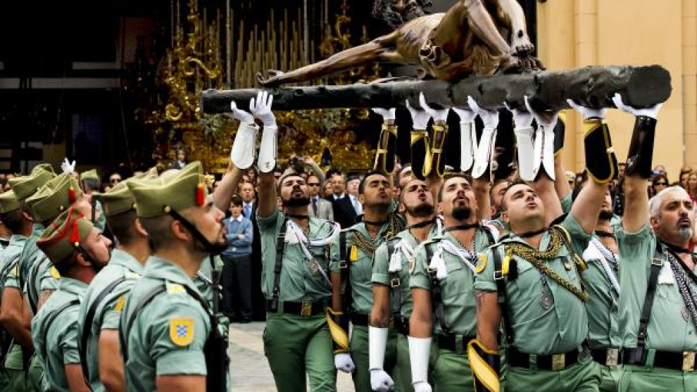 El traslado del Cristo de la Buena Muerte es uno de los acontecimientos más icónicos del Jueves Santo malagueño, en el que desembarca la cruz portada por legionarios al son del himno 'El novio de la muerte'. Un himno que, por cierto, ha usado Vox en algunos actos electorales —discoteca incluida— y que entonaron el pasado año ante la imagen religiosa varios ministros del Partido Popular.