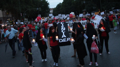A ritmo de marcha fúnebre, entre ruegos y plegarias. Así marcharon este viernes miles de personas por las calles de Madrid oficiando el entierro de la ciencia en una representación cómica de una realidad que, denuncian, es cada vez más palpable: la muerte de la ciencia española y de su futuro.