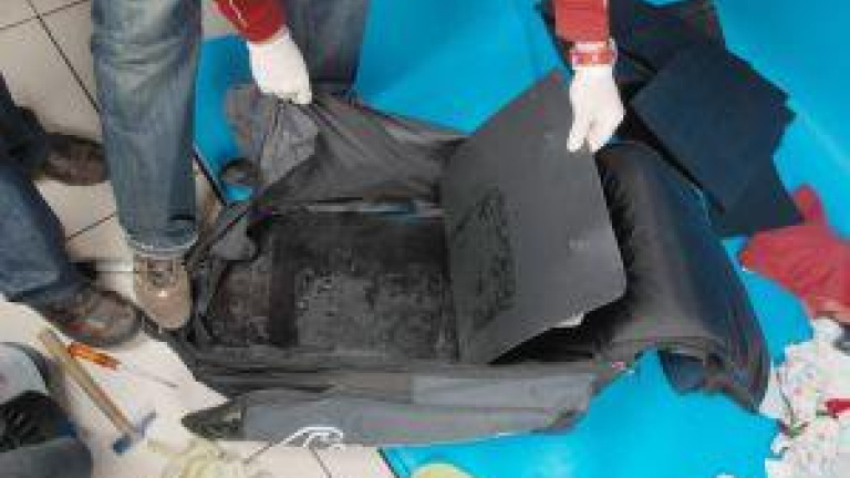 En el registro llegó la sorpresa. "Era muy novedoso. La cocaína estaba manipulada de tal manera que formaba parte de la propia bolsa de viaje. Las láminas de coca eran la base de la maleta", explica un responsable policial. Es la primera vez que se incauta un alijo de estas características en España aunque en Perú se detectó una partida similar el año pasado.