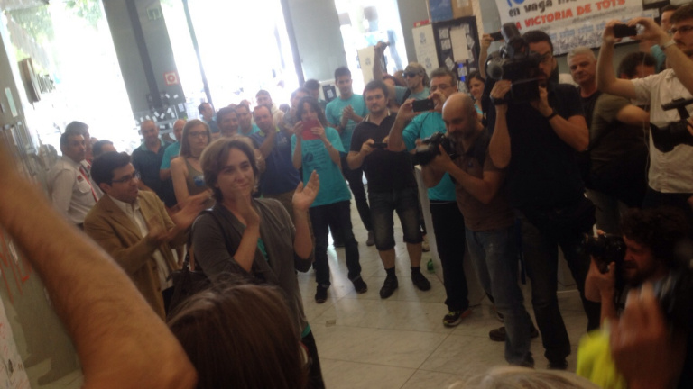 BARCELONA.- La alcaldable para la ciudad de Barcelona por la plataforma BComú, Ada Colau, ha estado este viernes en la sede ocupada del Mobile World Centre de la plaza Catalunya de Barcelona (en el Portal de l'Àngel). Ha asistido, junto a su segundo, Gerardo Pisarello, para apoyar a los trabajadores subcontratados de Telefónica, que permanecen en huelga en este espacio desde principios de abril. Los trabajadores, que han estado apoyados por la plataforma de la futura alcaldesa desde el primer momento, denuncian las condiciones laborales con las que miles de técnicos tienen que trabajar cada día.
