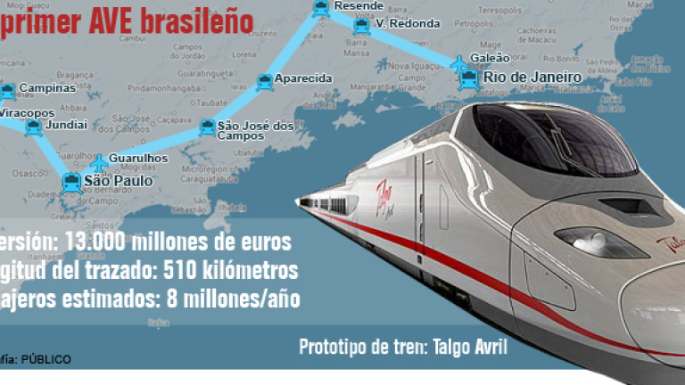 Un contrato de 13.000 millones de euros para construir 510 kilómetros de vía férrea y explotarla durante 40 años. Todo un negocio, si se tiene en cuenta que el tráfico de pasajeros estimado asciende a 22.000 al día, es decir, a más de 8 millones de clientes al año. Y todo ello a cambio del pago de un canon de 80 reales (unos 26 euros) por tren y kilómetro. Estas son las apetitosas condiciones del concurso para la construcción de la primera línea de alta velocidad brasileña, en el que las empresas españolas tienen, o al menos tenían, casi todas las papeletas para ganar.