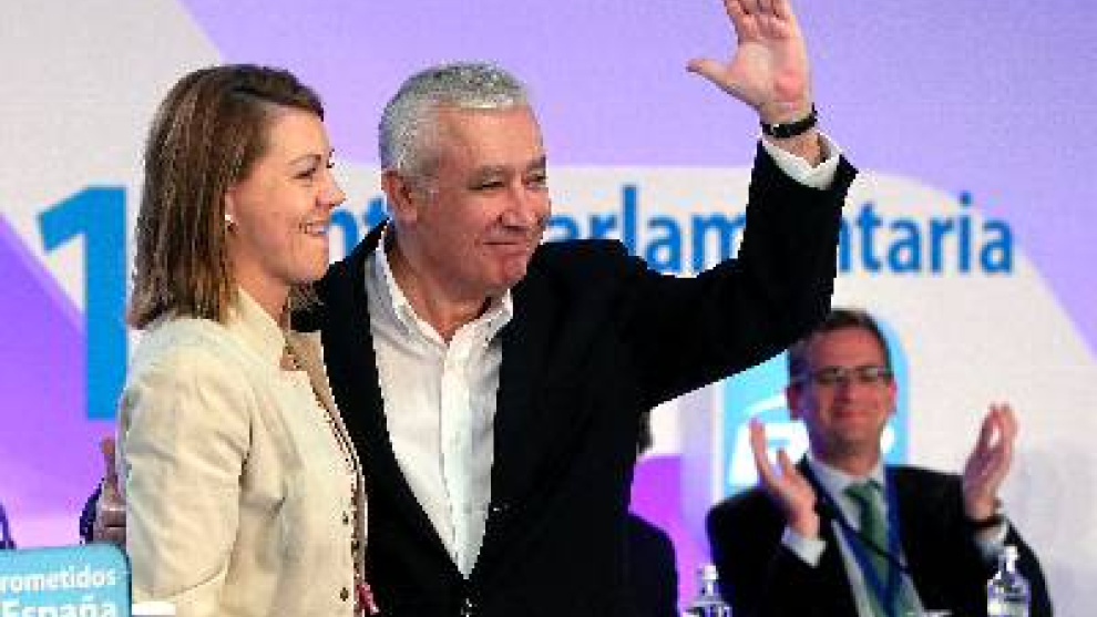 Hace un año que María Dolores de Cospedal tomó posesión de la Presidencia de Castilla-La Mancha, gobernada por los socialistas desde 1983 y a los que derrotó en 2011 por un escaño (25 - 24). La responsabilidad del cargo, a la que se suma la crisis económica de la región, no impidió a Cospedal mantener su puesto como secretaria general del Partido Popular y su despacho en la sede central del partido en Madrid. Con Soraya Sáenz de Santamaría entregada al Consejo de Ministros en su papel de vicepresidenta única y rostro principal del Gobierno, la número dos del PP ha ostentado un liderazgo absoluto y tranquilo en la calle Génova. Hasta ahora. Ahora es cuando Javier Arenas ha desembarcado en la calle Génova tras anunciar que abandona la presidencia del PP andaluz y proponer al alcalde de Sevilla como sucesor. La elección del nuevo cabeza de la derecha andaluza se producirá en un Congreso que, como apuntan los conservadores, tendrá más tintes de sentido homenaje de despedida a Arenas, la figura por excelencia de la derecha andaluza, que de bienvenida a Zoido.