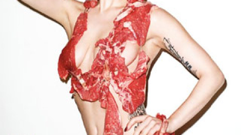 Bajo el paraguas de la revista masculina Vogue hommes Japan y frente al objetivo del fotógrafo Terry Richardson, Gaga posa con un mini vestido elaborado a base de filetes de carne cruda. No le falta detalle: desde el tocado de la cabeza hasta la pulsera en una de sus muñecas combinan con el rojo sangre que cubre cuidadosamente las partes más íntimas de la que ya es una de las nuevas reinas del pop.