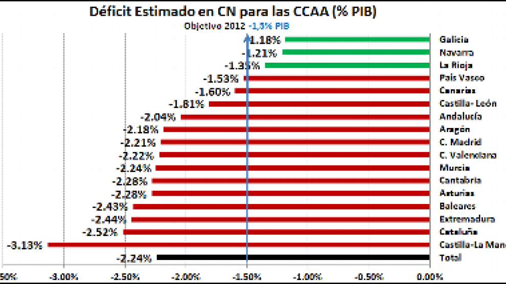 Los expertos de Fede dicen que hay "serias dudas" de que las autonomías sean capaces de cumplir con sus planes de ajusteFedea recoge sus estimaciones en su III Informe del Observatorio Fiscal y Financiero sobre las comunidades autónomas, dirigido por los profesores José Ignacio Conde y Juan José Rubio, basándose en los PEF 2012-2014 presentados por los Ejecutivos autonómicos. Según la Fundación, sólo Galicia y Navarra, con un déficit del 1,2% en ambos casos, y La Rioja (1,4%) cumplirían con el objetivo, mientras que Castilla-La Mancha (déficit del 3,1%) y Cataluña (2,5%) serían las que más se desviarían. Por su parte, de acuerdo con los cálculos de Fedea, en este supuesto, País Vasco se situaría al borde del 1,5%, Canarias obtendría un déficit del 1,6% y Castilla y León, del 1,8%. Andalucía se quedaría en el 2%; Aragón, Madrid, Comunidad Valenciana y Murcia en el 2,2%; Cantabria y Asturias en el 2,3%, y Baleares y Extremadura en el 2,4%.