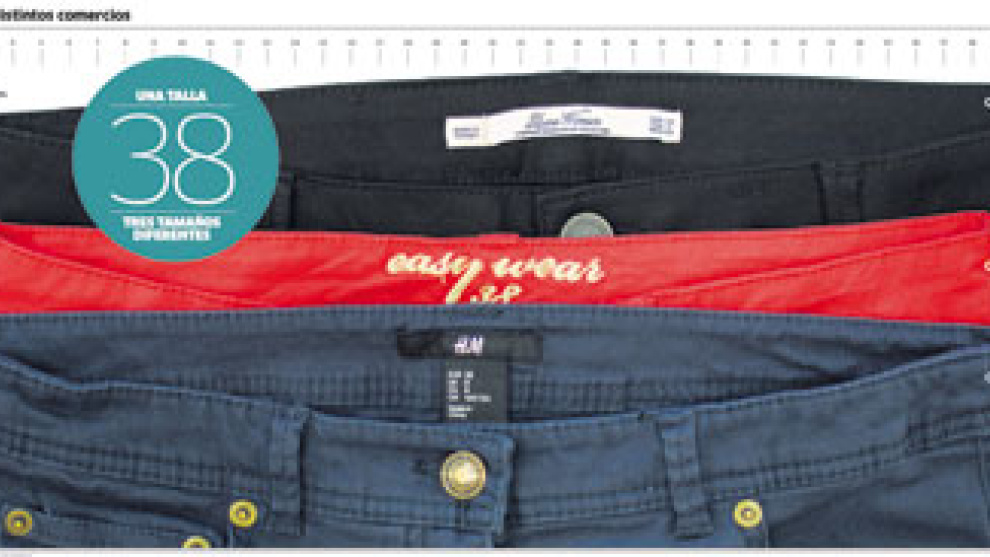 Tomemos como ejemplo un caso real. Una mujer se prueba unos pantalones en Zara (Inditex). Talla 38. Le quedan holgados. Una talla menos estaría mejor. "Habré adelgazado", se sonríe la susodicha. Su gozo en un pozo al meterse en El Corte Inglés. Allí se prueba otros pantalones similares, de la marca Easy Wear. Definitivamente, la talla 38 es la suya, aunque de cintura le vienen un poco justos. No le acaban de gustar. Con el semblante más serio se mete en H&M. Tercer intento: le cuesta subir el pantalón. La cremallera no cierra. Necesita una talla 40.