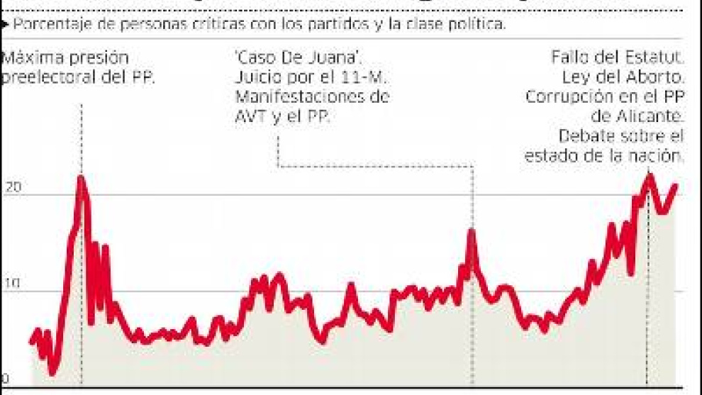 No siempre los ciudadanos aman a sus déspotas -lo estamos viendo en los países del sur, árabes o no- o, eventualmente, a sus líderes democráticos del Gobierno o de la oposición. Lo estamos viendo en las valoraciones que se dan en las encuestas a los líderes (la crisis es un factor explicativo de esto, en parte: poco más de tres puntos sobre diez tienen Zapatero y Rajoy) tanto en España como en otros lugares. También lo vemos en el incremento de indecisos, no votantes y otras variedades de la no-política en las mismas encuestas (aumentaron más de 12 puntos de porcentaje en las encuestas desde abril de 2008 hasta octubre de 2010, aunque en enero ese porcentaje se redujo de nuevo). Y lo vemos en los barómetros del CIS, de acceso público, en la llamada pregunta de agenda (en su versión agenda pública, pues hay otra en versión agenda personal o privada), cuyo gráfico acompaña este artículo, en el que pueden ver acontecimientos significativos coincidiendo con los picos de evolución de la desafección política.