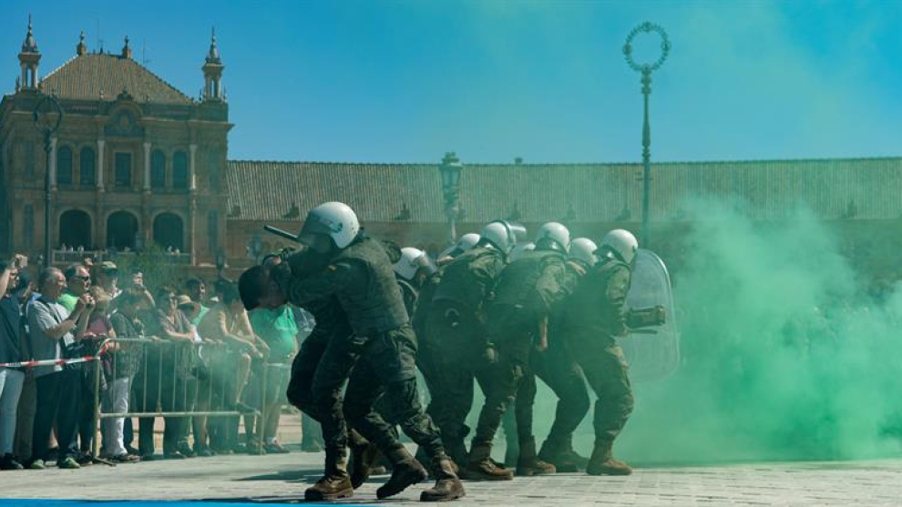 Sevilla lleva varios días tomada por las fuerzas armadas. Podría ser el comienzo de un parte de guerra o de la declaración de un alzamiento militar, pero se trata tan sólo de una celebración, dicen. En la capital de Andalucía se festeja hoy sábado el Día de las Fuerzas Armadas con la asistencia de los reyes de España, que presidirán el desfile por tierra, aire y río –mar no hay de momento en Sevilla- de más de 2.000 efectivos, 200 vehículos, 84 aeronaves, 4 barcos y un submarino, suficiente para montar una escaramuza.