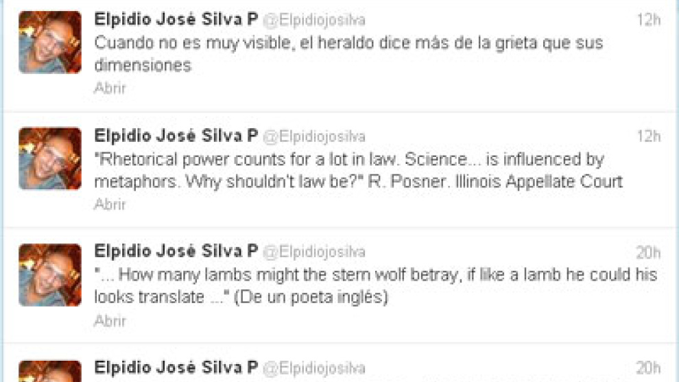 Elpidio José Silva Pacheco, el juez que ha enviado a la cárcel al exbanquero Miguel Blesa, ha debutado en la red social Twitter (@Elpidiojosilva) con reproches a la delincuencia económica, a la que compara con "una termita que carcome cualquier institución del Estado". El magistrado, que se cuida mucho de no mencionar a personas concretas, también habla de educación, la crisis o la organización territorial del Estado. Publicó su primer tuit el pasado sábado 8 de junio, tres días después de encarcelar a Blesa, y ya cuenta con 1.560 seguidores y subiendo.