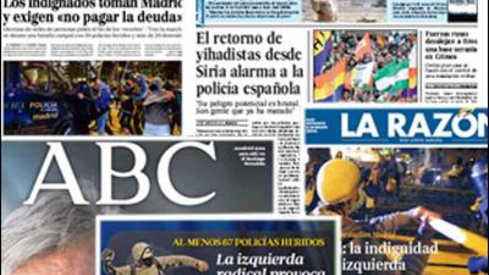 El Mundo (VER PORTADA) titula en su primera página a cuatro columnas "Los indignados toman Madrid y exigen 'no pagar la deuda'". En su subtítulo, califica los disturbios al término de la protesta de "batalla campal que dejó más de 100 heridos y 24 detenidos". Su editorial lo dedica a "Un descontento compresible, una marcha sin ningún recorrido".