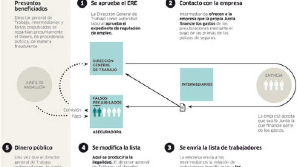 El desvío de fondos públicos a las cuentas de falsos prejubilados se presume millonario. Hasta ahora, Empleo ha admitido la existencia de 39 en 14 empresas. Uno de los objetivos declarados de la Junta es recuperar el dinero presuntamente malversado.