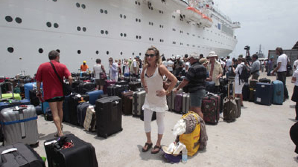 Con el crucero aún a unos pocos kilómetros del puerto, el equipaje de los pasajeros ya se había cargado en otros barcos, llevado a tierra y subido a autobuses que esperaban a llevar a los turistas a sus hoteles.
