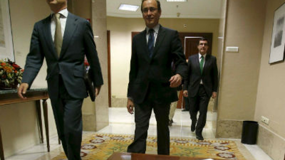 Ya la imagen valía por sí misma. El inminente nuevo presidente de Radio Televisión Española, Leopoldo González-Echenique, llegaba esta mañana a su examen parlamentario acompañado de la plana mayor del Grupo Popular –el que le propuso– y del secretario de Estado de Relaciones con las Cortes, José Luis Ayllón, el hombre de confianza de la vicepresidenta del Gobierno, Soraya Sáenz de Santamaría. Todos con sonrisa de oreja a oreja, satisfechos, pletóricos.