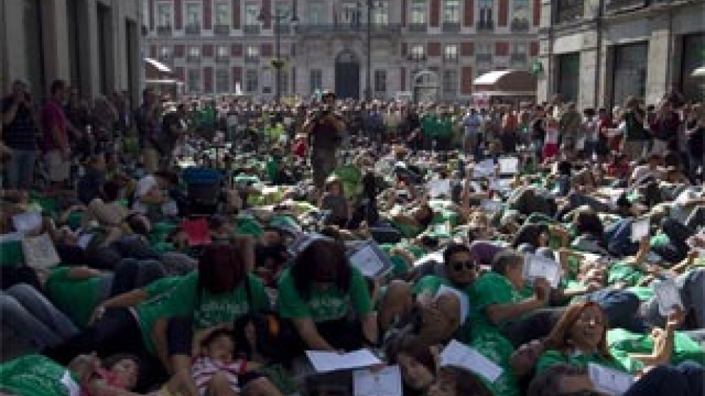Cientos de profesores, padres y alumnos tumbados durante un minuto en el suelo de la calle Preciados de Madrid. Con esta imagen, símbolo de la muerte de la escuela pública, se manifestaron ayer los profesionales de la educación para mostrar, una vez más, su rechazo a los recortes anunciados por la Comunidad de Madrid, informa Efe.