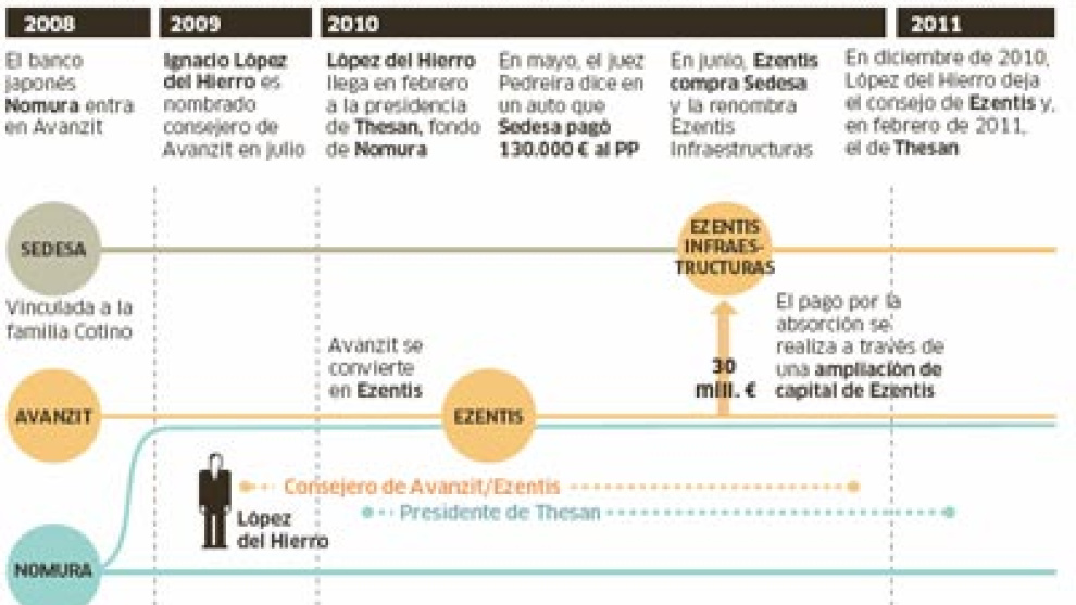 Nomura y ThesanEzentis es una compañía cotizada, con 5.000 trabajadores. El entonces dueño de Sedesa, Vicente Cotino, es sobrino del vicepresident de la Generalitat Valenciana, Juan Cotino. Y en el momento de la operación se sentaba en el consejo de Ezentis Ignacio López del Hierro, marido de la secretaria general del PP, María Dolores de Cospedal.