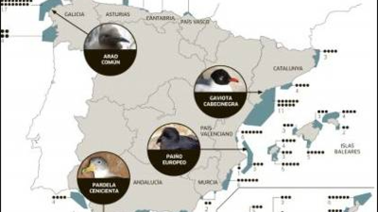 Cuatro años de marcaje, seguimiento y observación desde el litoral y en alta mar han permitido conocer la situación de las aves marinas en España, lo que hacen y los problemas a los que se enfrentan, así como identificar las áreas más importantes donde se alimentan, crían y pasan la mayor parte de sus vidas. España es el primer país que concluye el inventario de áreas importantes para las aves (IBA) en el mar. Se trata de 42 áreas de protección de 42.883 kilómetros cuadrados en total, lo que supone proteger el 5% de las aguas españolas, según los resultados del proyecto LIFE, coordinado por la Sociedad Española de Ornitología (SEO/Bird Life) y presentado ayer en Madrid. El Convenio de Biodiversidad de la ONU, firmado por España, fijó como objetivo que al menos el 10% de la superficie marina esté protegida en 2012. Ahora sólo hay un 0,9%.