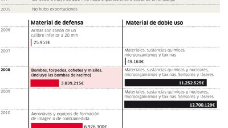 Las bombas de racimo a las que se refiere el diario norteamericano podrían estar integradas en la partida de material clasificado por Comercio en la categoría de "Bombas, torpedos, cohetes, misiles" que empresas españolas exportaron a Libia en 2008 por valor de 3,8 millones. No obstante, fuentes de esta Secretaría explicaron el pasado febrero, cuando estalló el conflicto, que en realidad se trataba de "lanzagranadas".