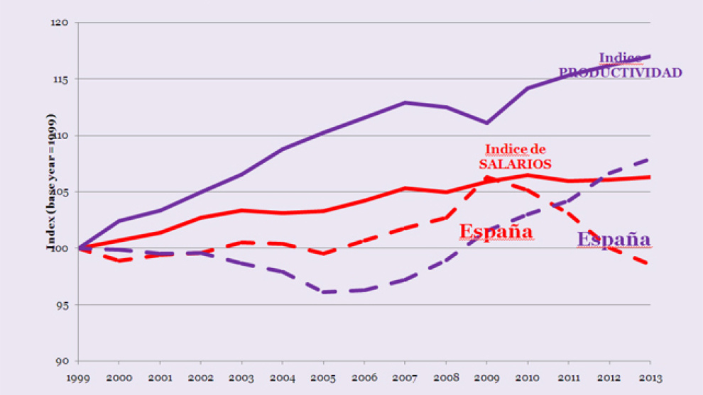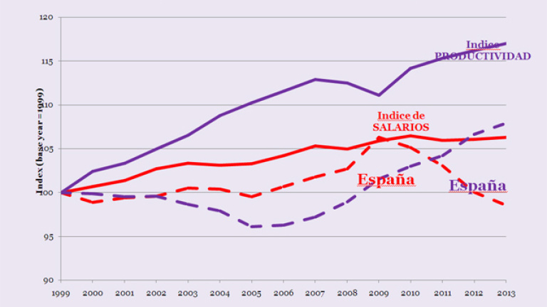 Los asalariados españoles producen más y cobran menos desde 2009. Es una de las conclusiones del Informe Global sobre salarios 2014-2015 que este viernes ha presentado la Organización Internacional del Trabajo (OIT) en su oficina en España. Según el informe, la productividad ha crecido alrededor de ocho puntos desde el 2009, mientras que los salarios han disminuido más de 6,5 puntos. Es una brecha entre productividad y salarios que no se corresponde con la evolución en el global de países desarrollados (Zona Euro y Estados Unidos), donde esta brecha no es tan acusada. Este informe llega, después de otros datos dramáticos de varios organismos, mientras sindicatos y patronal discuten el nuevo acuerdo sobre la negociación colectiva, en el que los sindicatos piden un aumento salarial mientras los empresarios quieren mantener la moderación, con un crecimiento del 0,6%, según las últimas declaraciones de sus representantes.