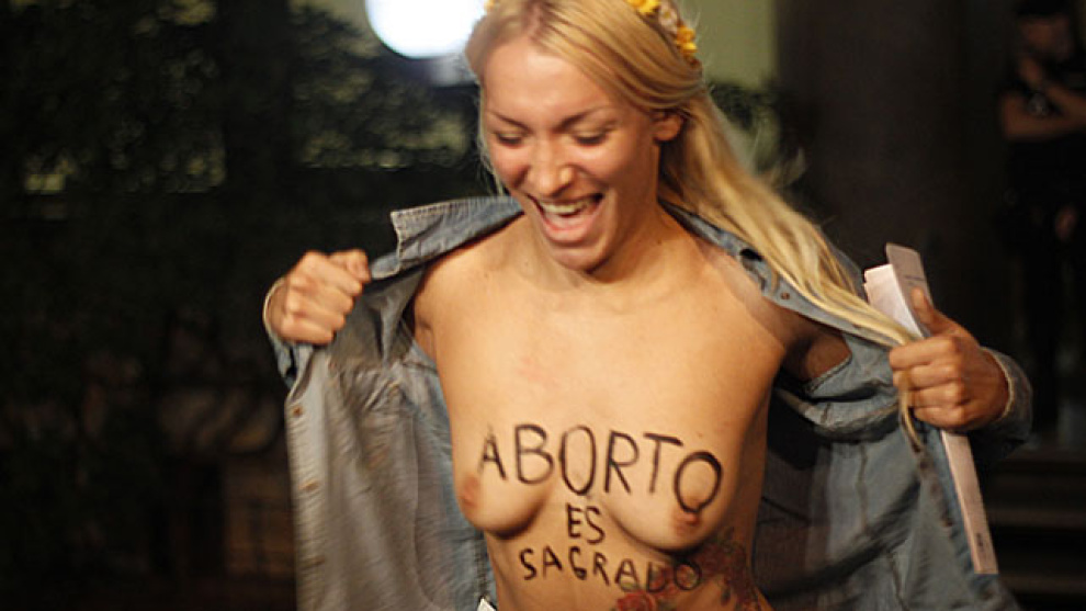 A las 20.30 horas de este martes, la dos integrantes extranjeras de Femen que aún permanecían retenidas, salían de los Juzgados de Plaza Castilla. Lo hacían con el puño en alto y, como acostumbra este colectivo feminista, con el torso desnudo en el que aún se podía leer la frase "aborto es sagrado" con la que han interrumpido el pleno del Congreso de esta mañana para protestar contra la reforma de ley del aborto que está preparado el ministro de Justicia , Alberto Ruíz-Gallardón.