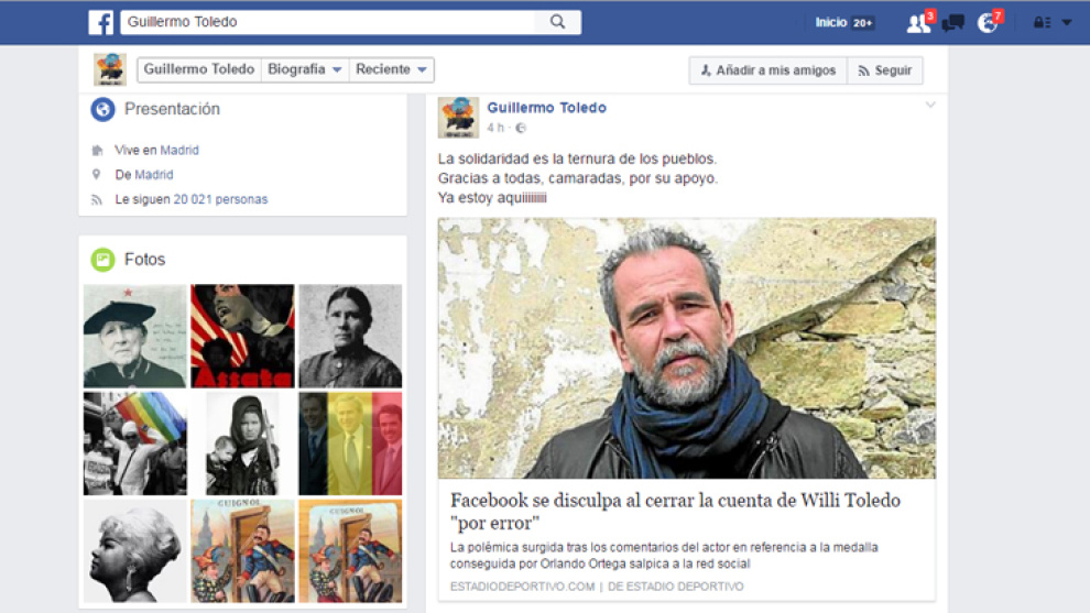 Facebook restaura la cuenta de Willy Toledo: "Lamentamos este error"