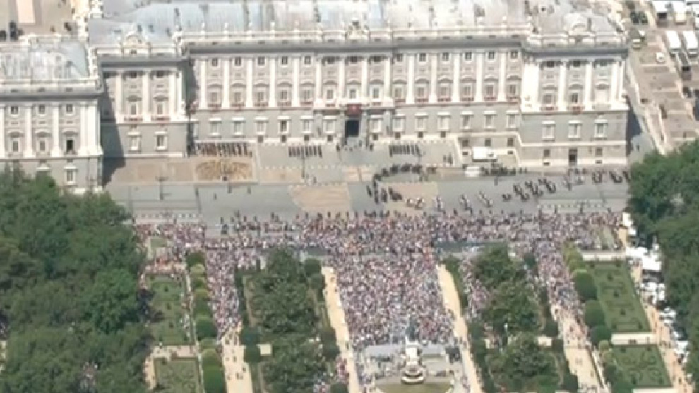 Un real pinchazoNi en las propias imágenes de TVE se han visto las multitudes que la cadena pública anunciaba, lo que ha provocado la hilaridad en la red social Twitter. Los pocos planos aéreos abiertos mostrados por la señal institucional de TVE, así lo mostraban. La escasa afluencia de público ha sido incluso comentada entre los invitados a la recepción en el Palacio Real, según ha podido saber Público, donde los más benévolos achacaban el pinchazo al calor y a las fuertes medidas de seguridad.