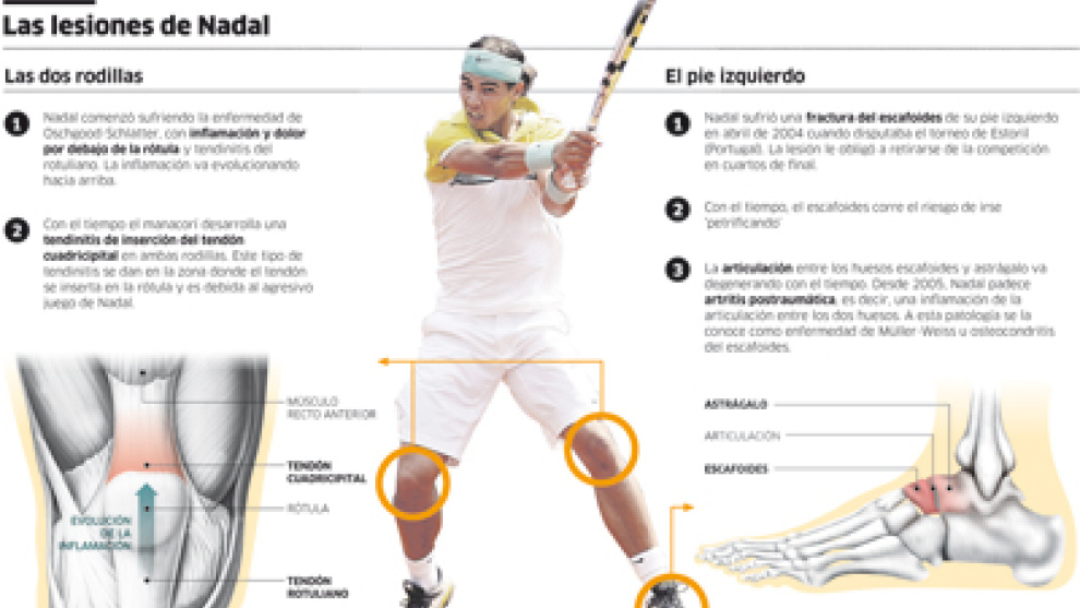 "Si Nadal tiene realmente edema óseo [acumulación de líquido en el interior del hueso], debe descansar al menos un mes y medio. Ahora mismo". Estas palabras las pronuncia un prestigioso traumatólogo deportivo que prefiere quedar en el anonimato. "Sufre un proceso crónico que ha evolucionado de forma lógica con inflamación en el tendón rotuliano que ha progresado al tendón cuadricipital en su punto de inserción con la rótula", explica este médico de un club de fútbol de Primera división.