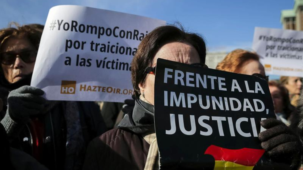 La Asociación de Víctimas del Terrorismo (AVT) ha protestado hoy, en la madrileña plaza de Colón contra el Gobierno por sus incumplimientos electorales y por una política antiterrorista con la que se está otorgando a los etarras, opinan, be