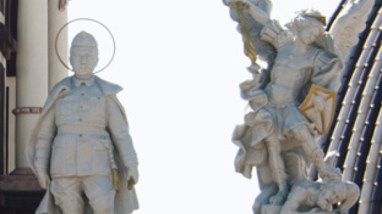 Junto a las esculturas de san Pedro, san Miguel, san Francisco de Paula, san Fernando y san Francisco de Asís, la estatua de Franco (san Francisco Franco para esta iglesia), preside la parte alta del edificio y se hace visible más allá de los muros de hormigón de unos cinco metros que rodean a la finca. La Iglesia Palmariana, rechazada por la Iglesia Católica, cuenta entre su santoral también con san Adolfo (Adolf Hitler), san José Antonio Primo de Rivera, san José Calvo Sotelo, san Luis Carrero Blanco, santa María Eva Ibarguren, san Francisco Jiménez de Cisneros o incluso san Cristóbal Colón.