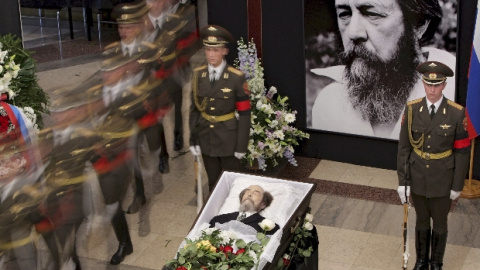 El cuerpo de Solzhenitsin fue trasladado al Monasterio Donskói anoche, después de que miles de moscovitas acudieran durante el día para despedirse de él a la capilla ardiente instalada en la sala fúnebre de la Academia de Ciencias de Rusia.