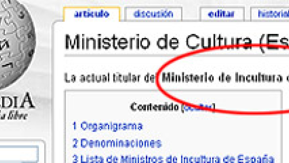 El Ministerio de Cultura ha amanecido este lunes en la enciclopedia virtual más popular de Internet, la Wikipedia, convertido en "Ministerio de Incultura", y su titular, Ángeles González-Sinde, y todos sus antecesores, incluidos en la lista de "ministros de Incultura".