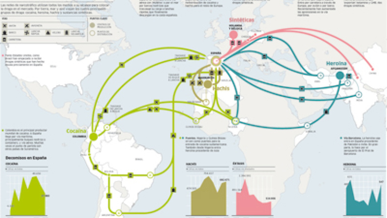 Las drogas de diseño lo tienen mucho más fácil. Holanda sigue siendo el productor del 90% de estas sustancias. La carretera es su camino habitual, incluso para la que viene de países más al Este, como Polonia y Chequia, cuyos narcos parecen querer hacer la competencia a los de los Países Bajos. No es la única novedad. Algunas sustancias, como la Ketamina o el GHB, parten de sitios tan lejanos como China o la India. Nuevas autopistas que comienzan a dibujarse en los mapas.