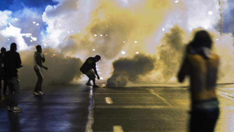 La policía disparó botes de humo y gases lacrimógenos para tratar de dispersar a varias decenas de manifestantes que provocaron los incidentes en esa ciudad del estado de Misuri, donde el joven Michael Brown resultó muerto por disparos de un policía en circunstancias aún por aclarar.