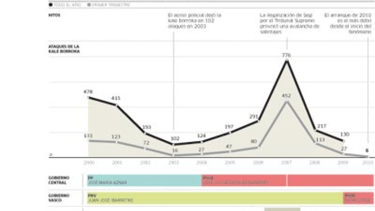Capacidad de reacciónEn cualquier caso, la capacidad de reaccionar con violencia en las calles a decisiones judiciales y operaciones policiales ha desaparecido prácticamente. En 2009 hubo una media de 10,8 ataques al mes, sólo superada en febrero, antes de las elecciones autonómicas a las que no pudo concurrir Batasuna, con 18 ataques. Y durante las fiestas patronales de agosto, cuando se registraron 25 sabotajes. Cifras en todo caso muy alejadas de los 384 actos de kale borroka en febrero de 2007, el peor mes de la década, y que siguieron a la decisión del Tribunal Supremo de declarar ilegal a Segi.