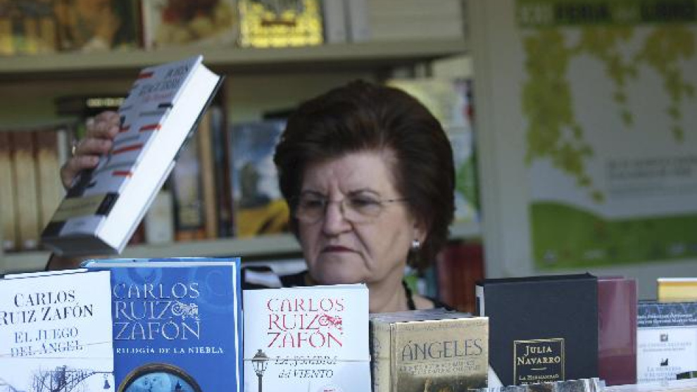 Durante la conversación, María Jesús Alba atiende la venta de libros en su caseta: un señor de cierta edad compra el último libro de Carlos Ruiz Zafón, "El juego del ángel", y al momento una joven se lleva cuatro "encargos" que tiene apuntados en una libreta: "El juego del ángel", de nuevo; "Harry Potter y las reliquias de la muerte", de J.K. Rowling, "El niño con el pijama de rayas", de John Boyne, y "Villa Diamante", de Boris Izaguirre.