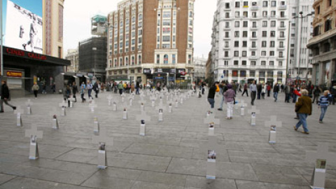 La Organización Igualdad Animal ha convertido esta mañana la madrileña Plaza de Callao en un cementerio instalando cien cruces por cada animal que "ha sido explotado" en granjas, mataderos, circos o laboratorios (aquí todas las fotos).